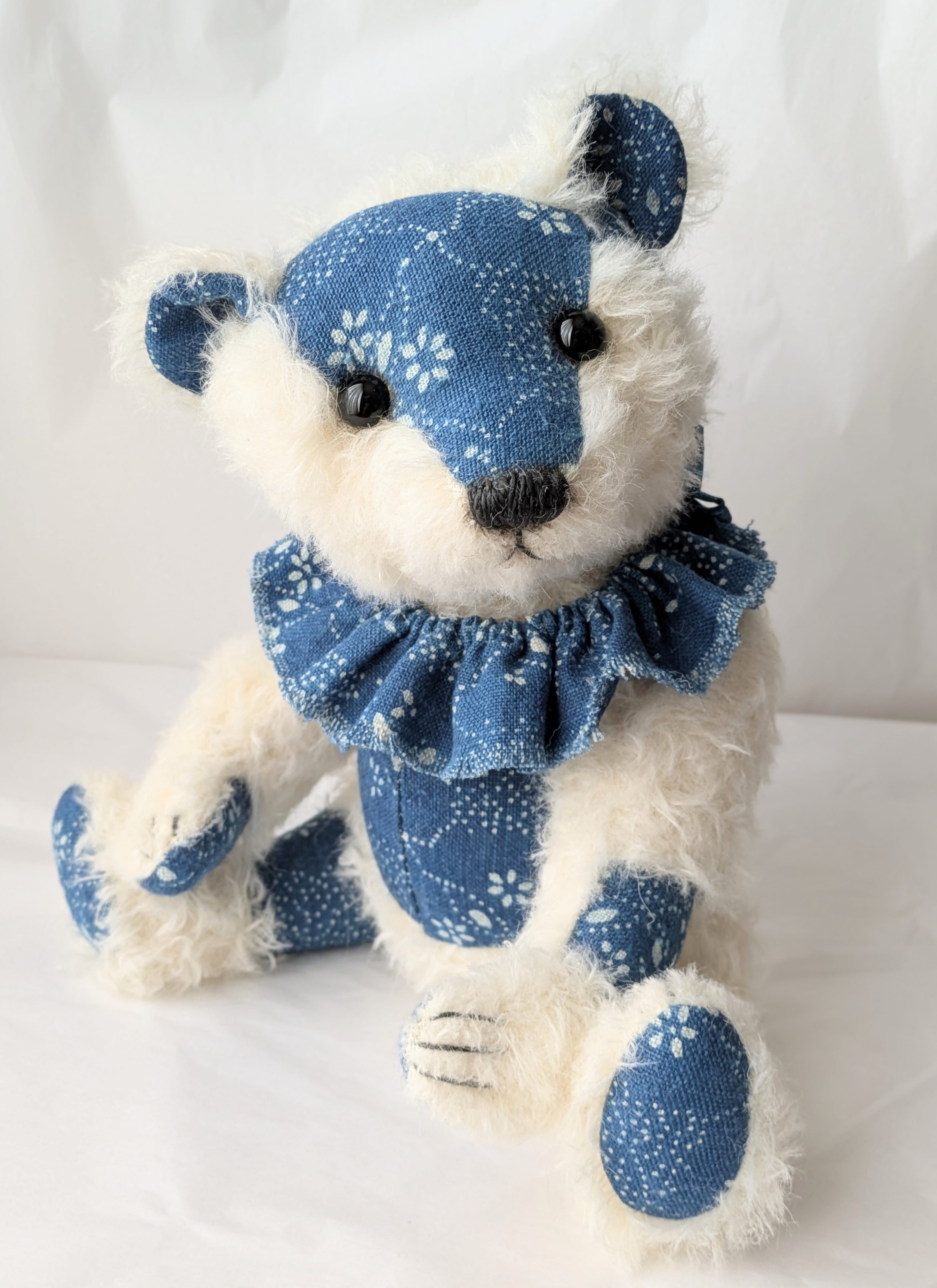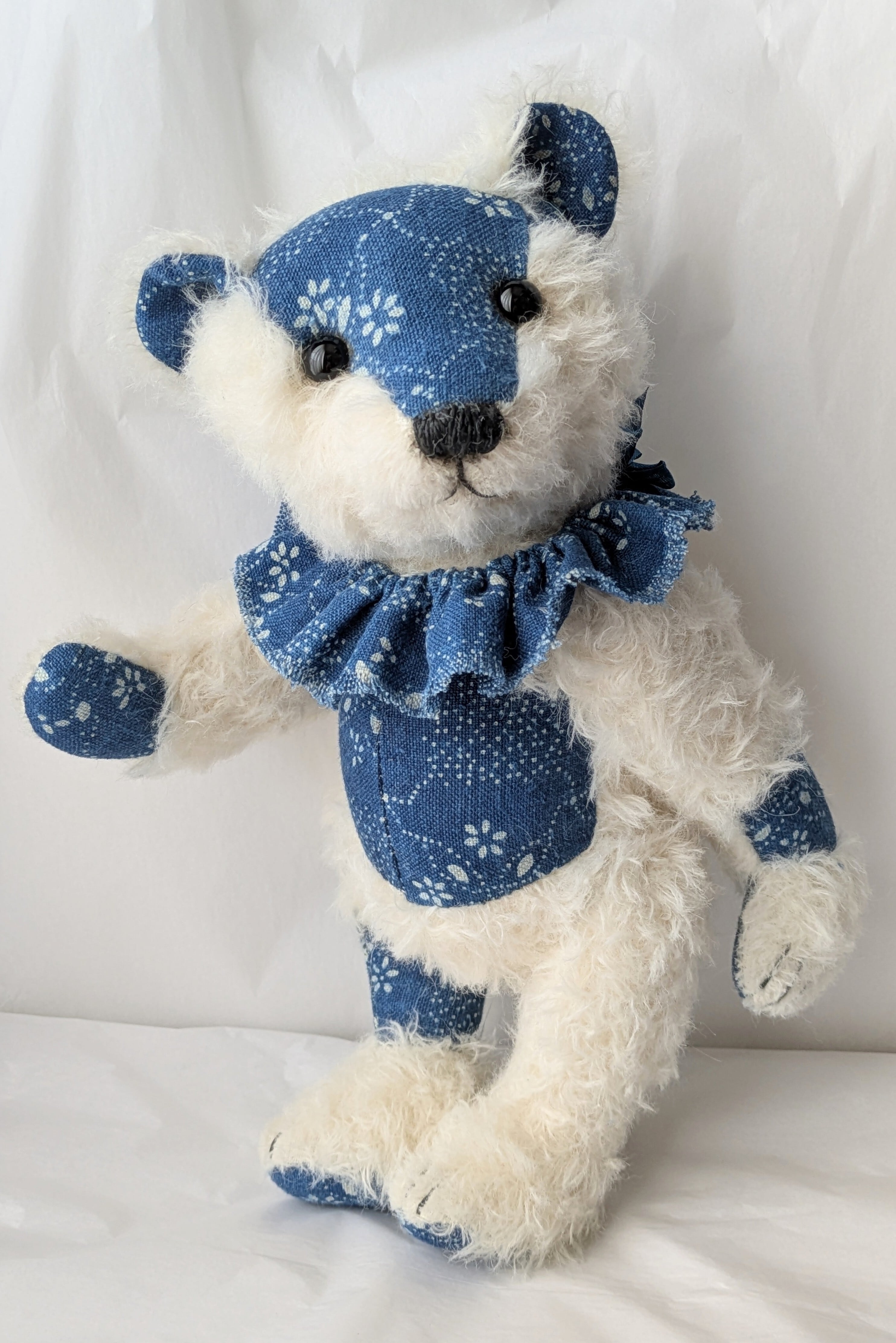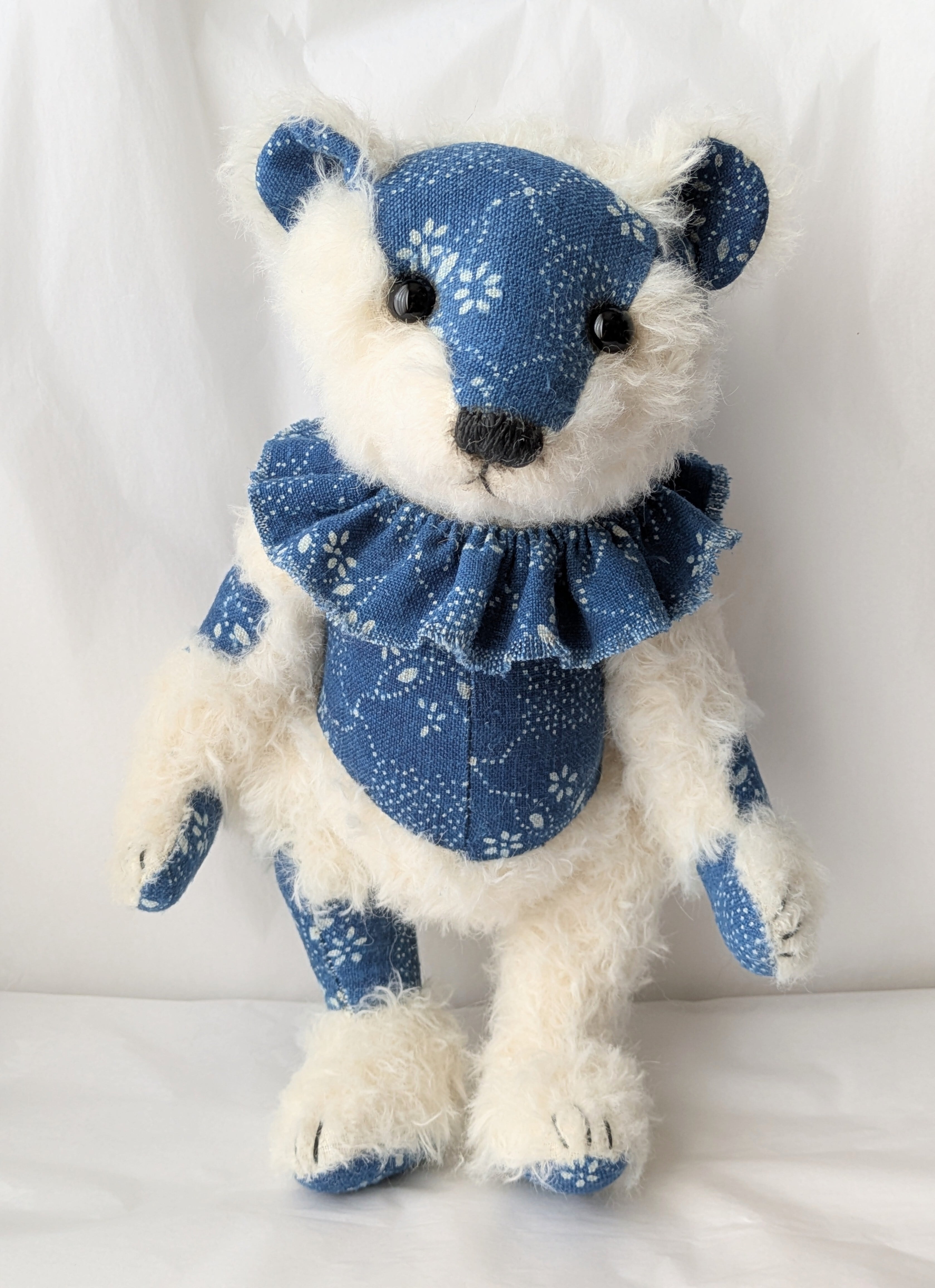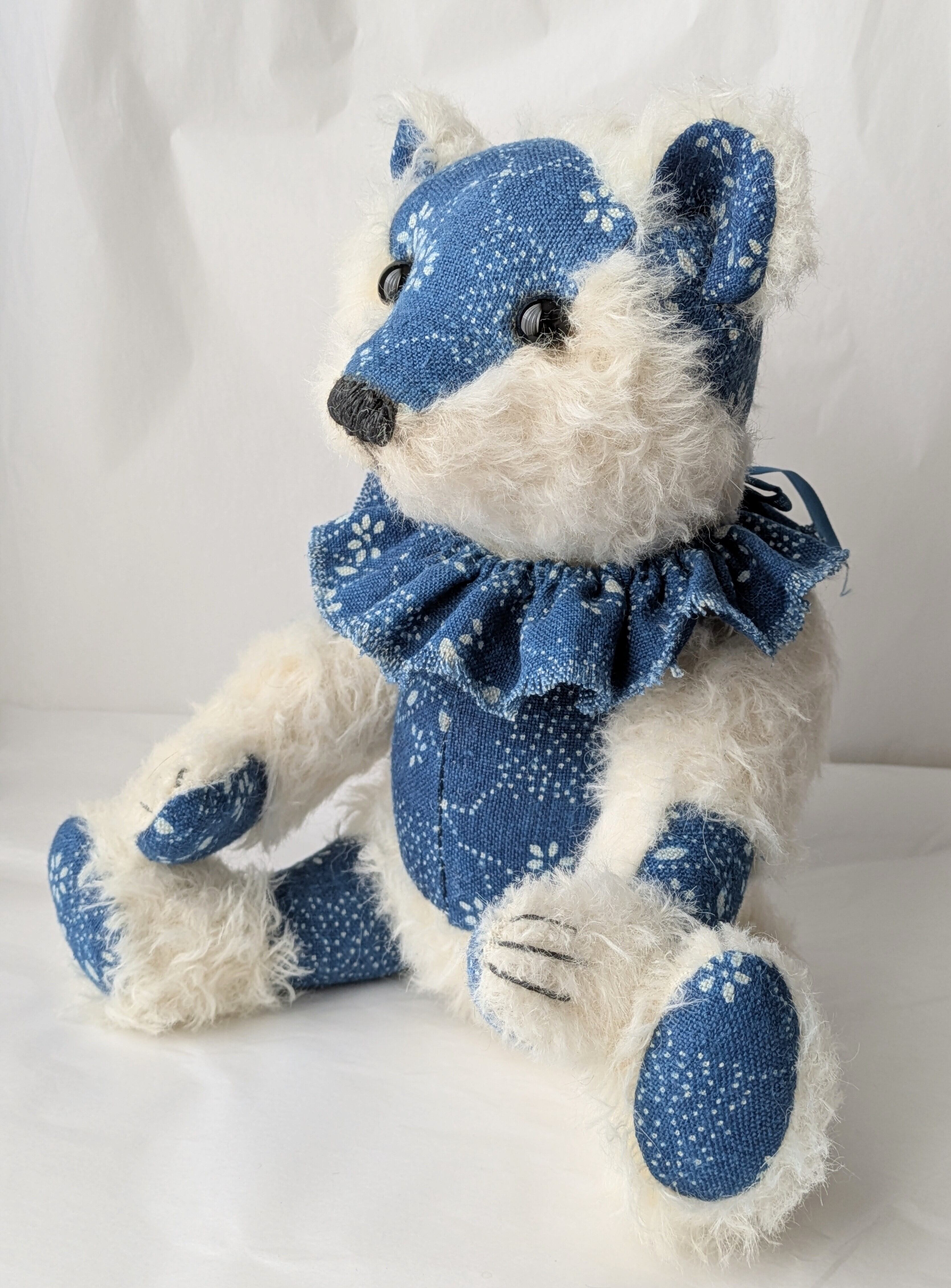 ドイツ製モヘア生地とハンガリー製藍染リネン生地を組み合わせたくまのぬいぐるみです。