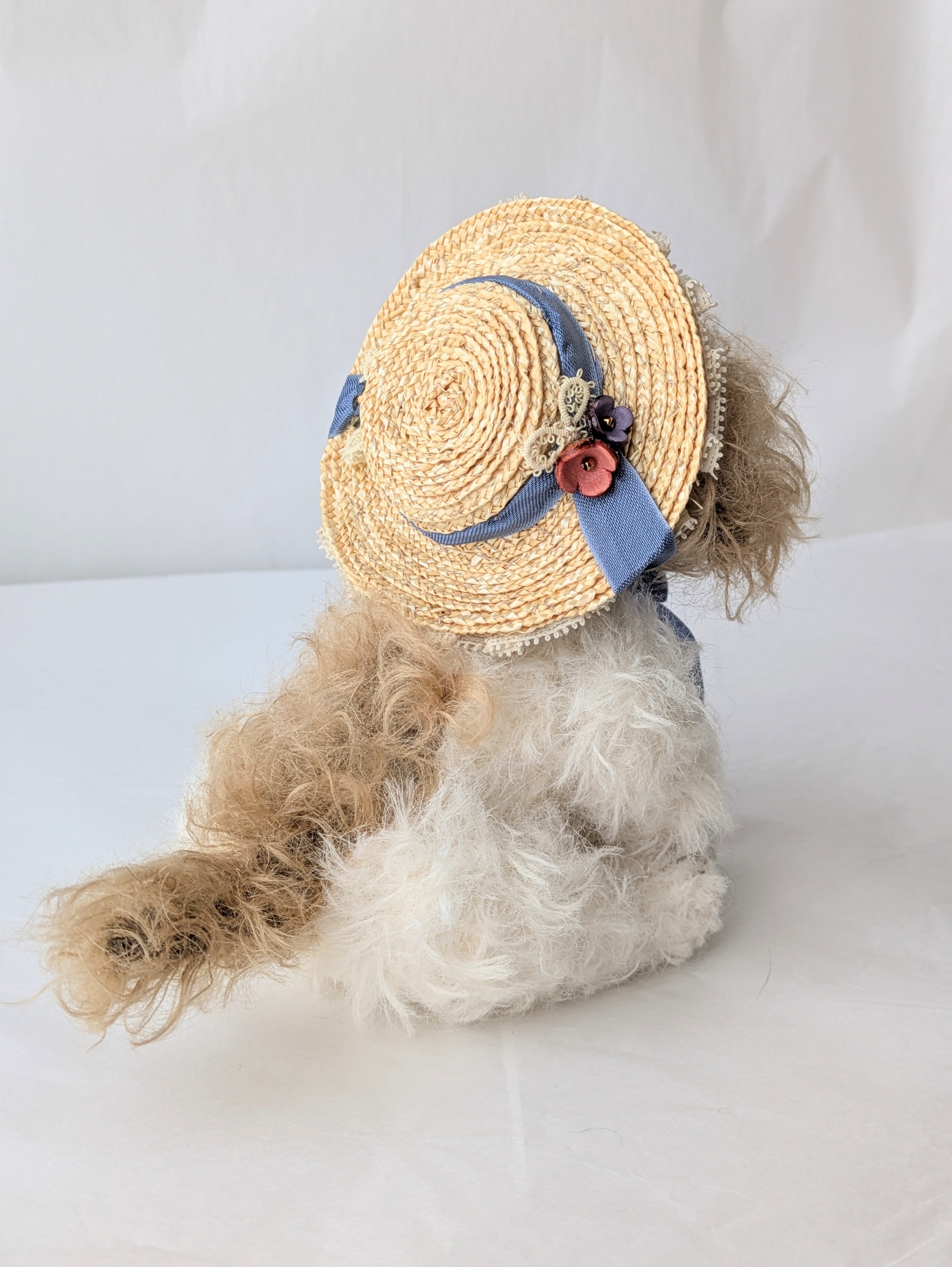 革製お花の飾りを付けた藁帽子。